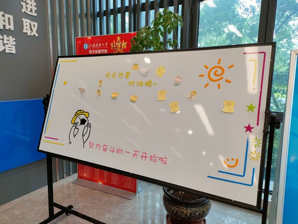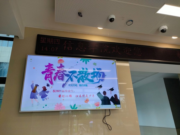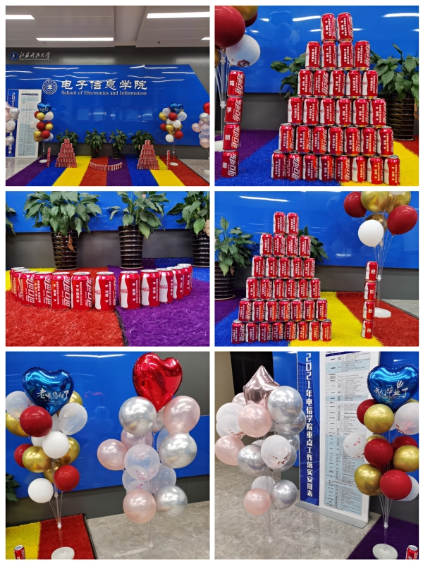 为引导毕业生体会成长变化,感念师生情谊,记录与导师、同学在学校生活、学习的情况,表达真情实感,2021年6月22日电子信息学院在学院大厅精心布置了“毕业打卡点”——铺设彩虹地毯、装饰气球树、为毕业生定制专属可口可乐、设置留言板,开展了一场生动活泼的爱校荣校教育,增强了毕业生对母校的归属感与自豪感,引导毕业生饮水思源,心系母校、感恩母校,强化责任担当意识。