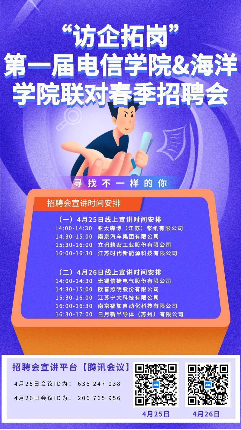 为进一步拓展就业渠道,切实做好疫情期间毕业生就业服务工作,认真落实中央“六稳”“六保”精神,电子信息学院和海洋学院于2022年4月25日、26日联对举办“百校千企万岗”老员工就业帮扶“送岗直通车”直播荐岗活动。优选9家企业,涵盖大型国企、500强公司等单位,招聘面向海洋、电信、机械等学院,共计提供招聘岗位超百。
