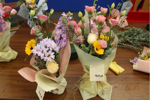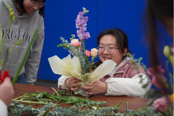 活动中,负责人为现场同学介绍了花材种类、插制步骤以及艺术插花技巧,从颜色的选择到位置的布局,大家在生动演示中摩拳擦掌,跃跃欲试。在负责人的指导下,同学们将修剪好的花束插入海绵中,一束束精美细致、色彩纷呈的插花作品令人赏心悦目。大家欣赏着彼此的花卉,享受作品成果带来的欣喜感和成就感。