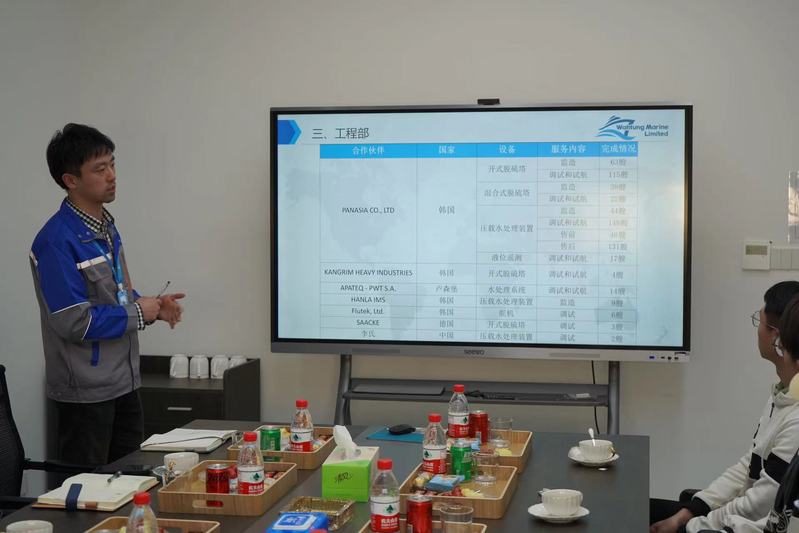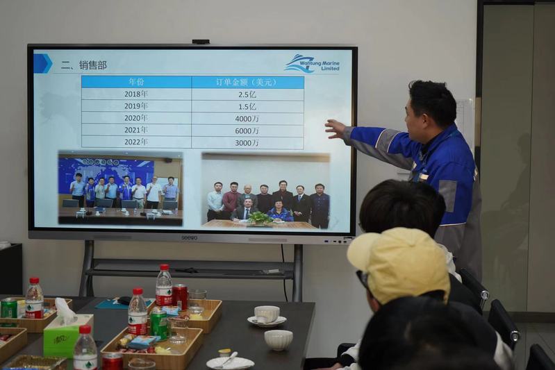 江苏华通船舶工程有限公司董事长金加俊接待学院一行。金加俊首先对学院的到访表示热烈欢迎,并对学校为公司培养了众多优秀毕业生表示感谢。随后,销售部助理成卯磊与总经理助理杜泳辰分别就公司发展历程、产业结构和岗位设置、薪资待遇等方面做了具体介绍。