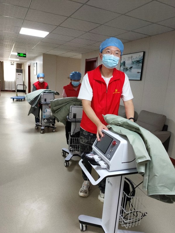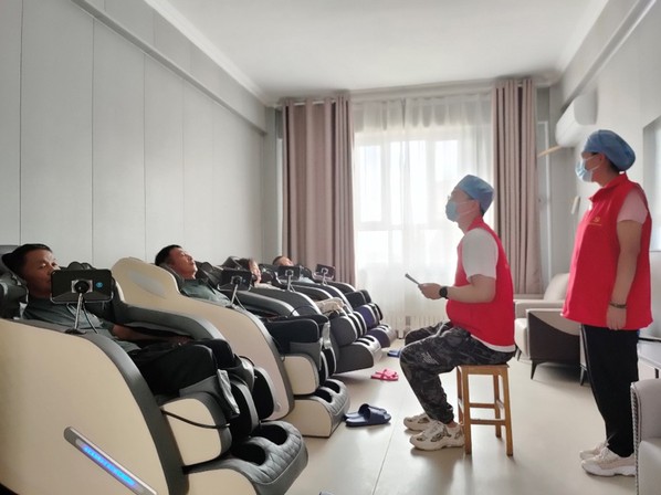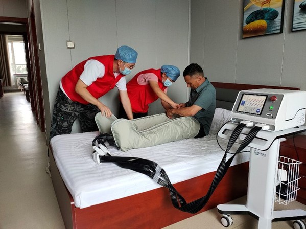 图为实践团成员运用空气波治疗仪对退伍军人进行腿部按摩。张京 供图