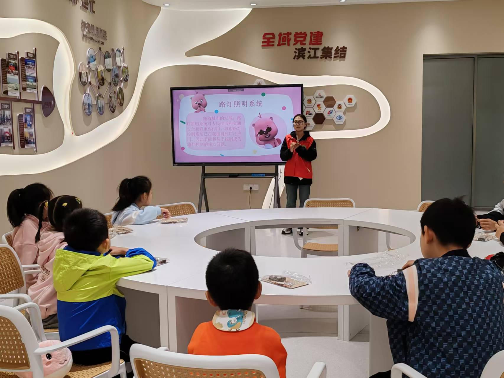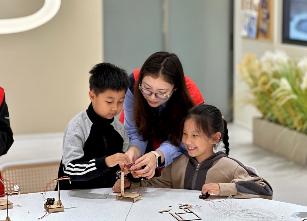 动手环节,“自”造路灯。孩子们跟着讲解员的演示一步一步连接电路,安装光敏电阻,制作路灯模型。经过半个小时的制作,随着场景灯光的熄灭,小朋友们的路灯一个个都明亮了起来,犹如夜空中的星星。小朋友们欢呼雀跃,庆祝自己的成功。亲手制作光控灯,不仅激发了青少年们的创作灵感,还锻炼了他们的动手能力。