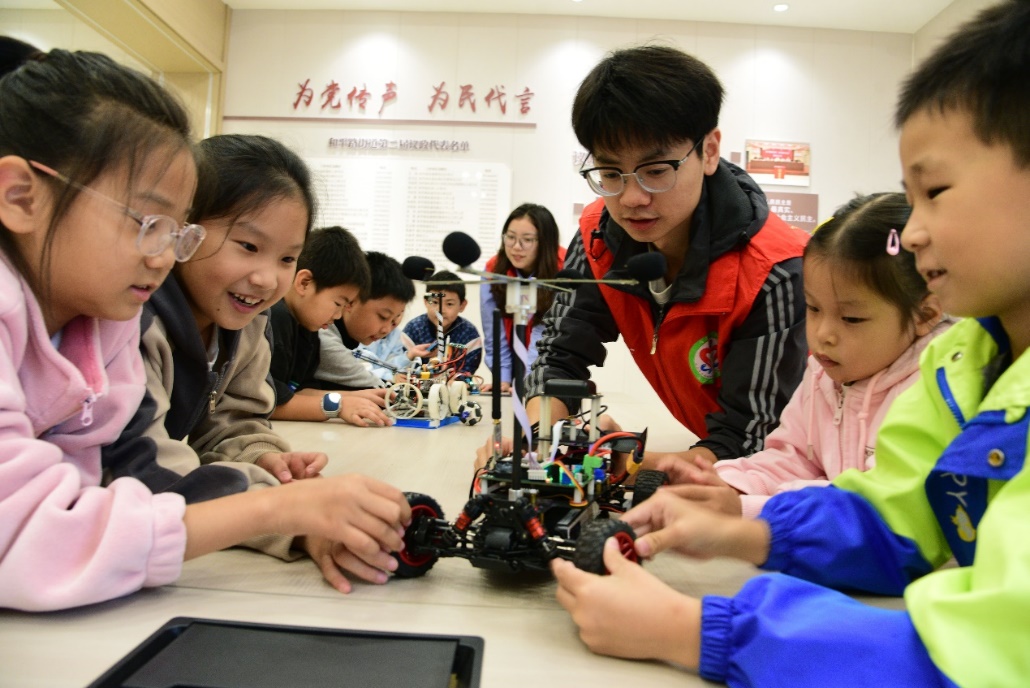 童心探科学,逐梦创未来。为展现betway西汉姆联特色,让小朋友们对自动化产生更加浓厚的兴趣,志愿者们将智能小车带到了现场,并向小朋友们介绍并解释了其中原理。小朋友们天马行空的想象力不仅满足了自己的好奇心,也让志愿者们有了很多的收获。