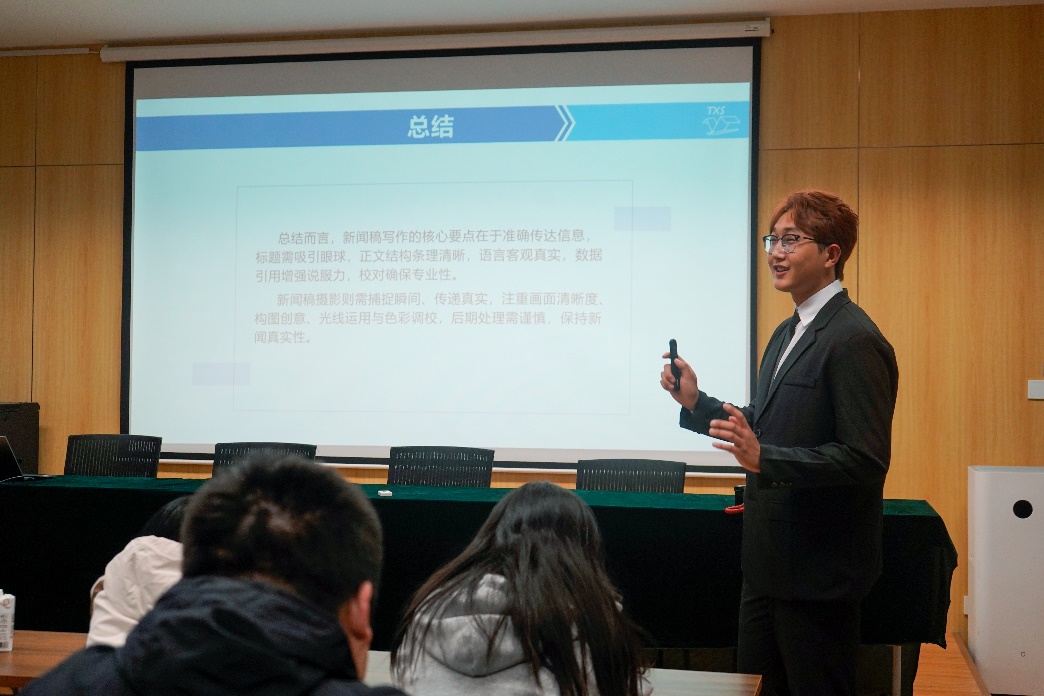 图为老员工通讯社王尊航同学在讲述标题三要素