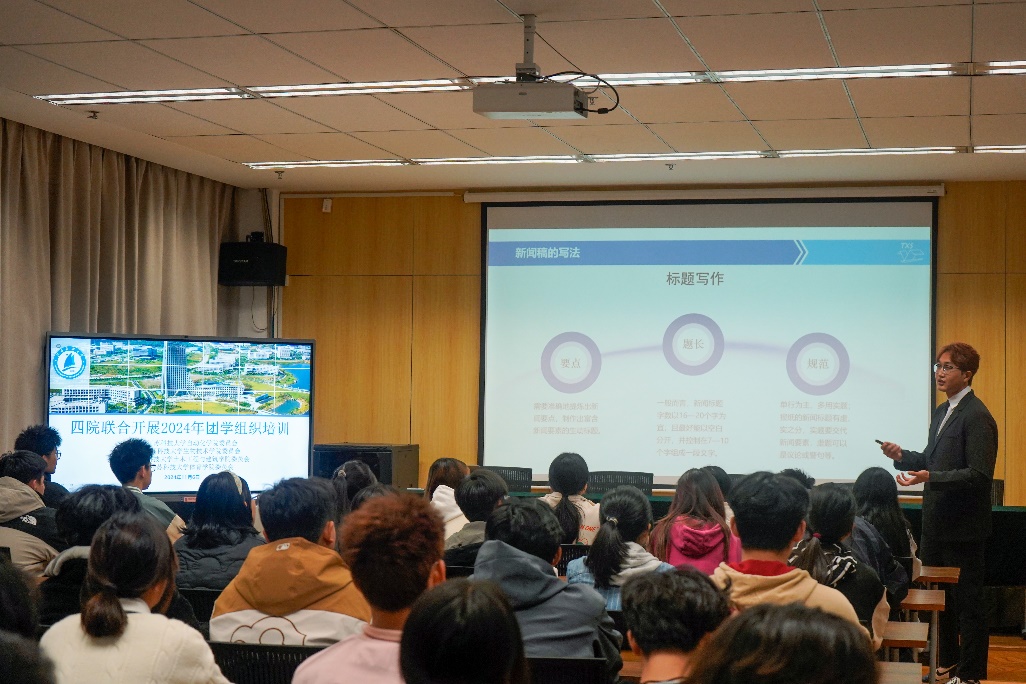 为强化四院团学组织的交流合作,提升团学组织成员的综合素质及业务能力,11月6日至7日,betway西汉姆联邀请到党委宣传部老员工通讯社王尊航同学和本院员工会主席团成员戴毅杰同学前来主讲,并联合生物技术学院、土木工程与建筑学院、体育学院于betway西汉姆联学术报告厅进行新闻文稿写作、摄影培训、团队协作、文件规范等内容。