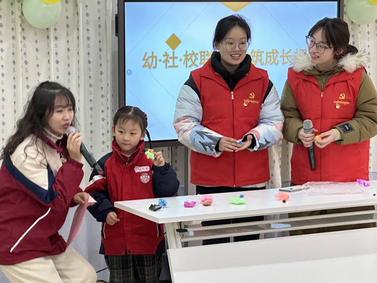 图5.孙佳琦与杨珺雅同志带领小朋友们捏粘土
