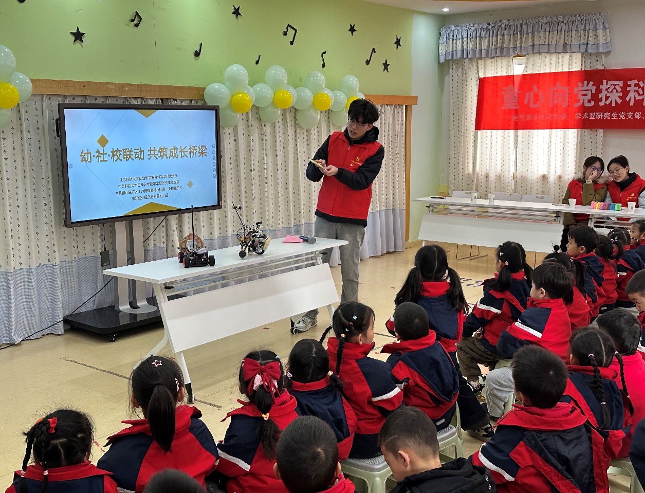在活动的第一个环节,常浩同志带来“智能小讲堂”,为幼儿园的小朋友们讲解了支部成员亲手制作的智能小车。常浩同志通过简单易懂的语言,将智能小车的各个部件如摄像头、主控板等形象地比作小车的“眼睛”和“大脑”,让小朋友们轻松理解这些科技元件的功能和作用。他通过生动有趣的故事和现实生活中的例子,将复杂的科技知识转化为小朋友们能够理解的内容,使他们在轻松愉快的氛围中对科技产生浓厚兴趣。