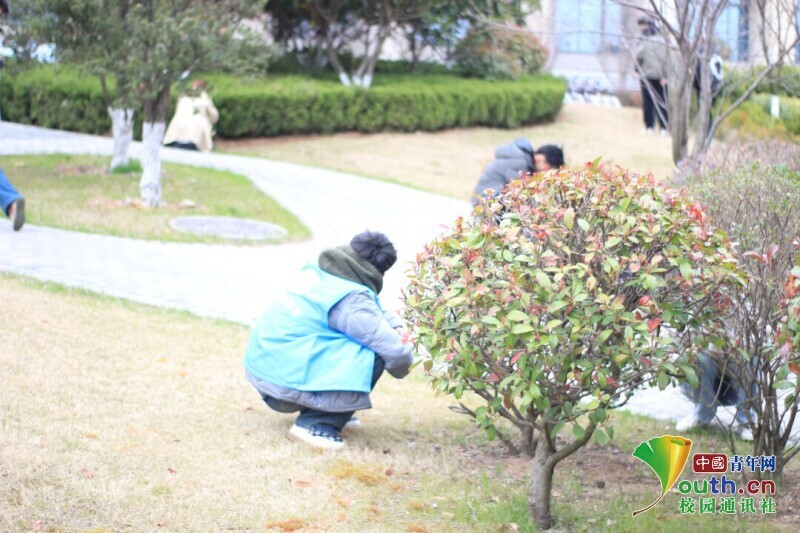 图为同学们在学校花坛寻找合适的落叶,为后续制作落叶画做准备。中国青年网通讯员 韩熠桢 供图