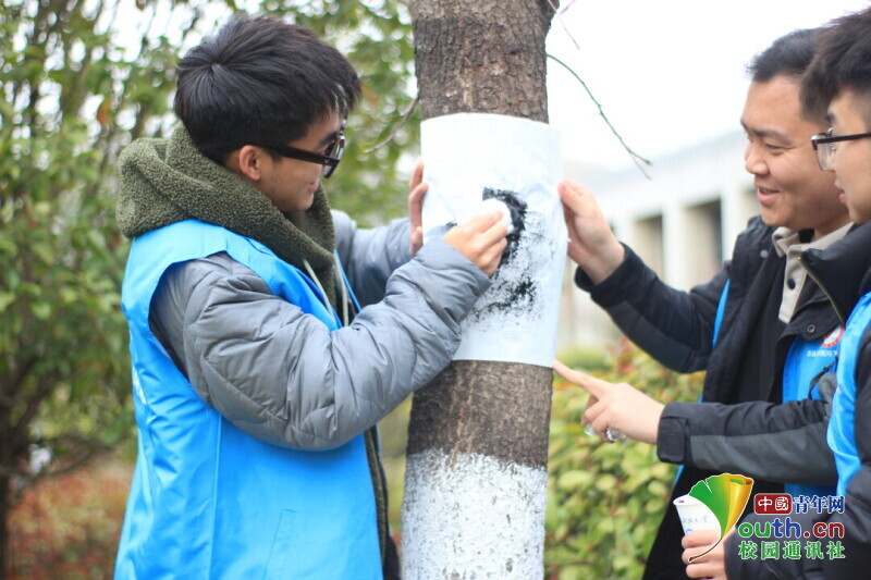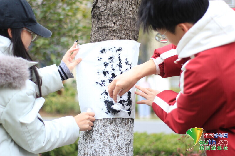 图为同学们将宣纸覆树干上进,用墨水进行拓印。中国青年网通讯员 韩熠桢 供图