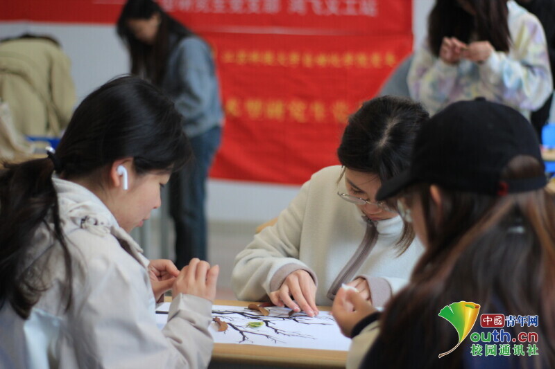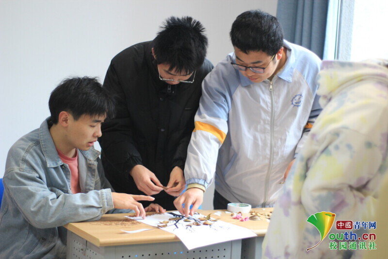 图为参与同学三人一组共同商量如何使作品更加美观。中国青年网通讯员 韩熠桢 供图