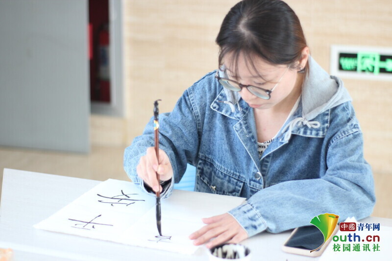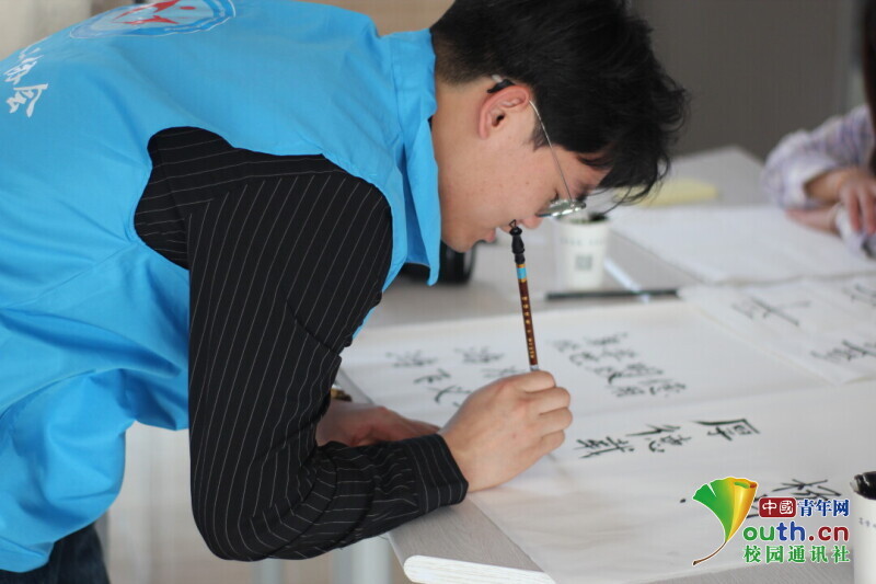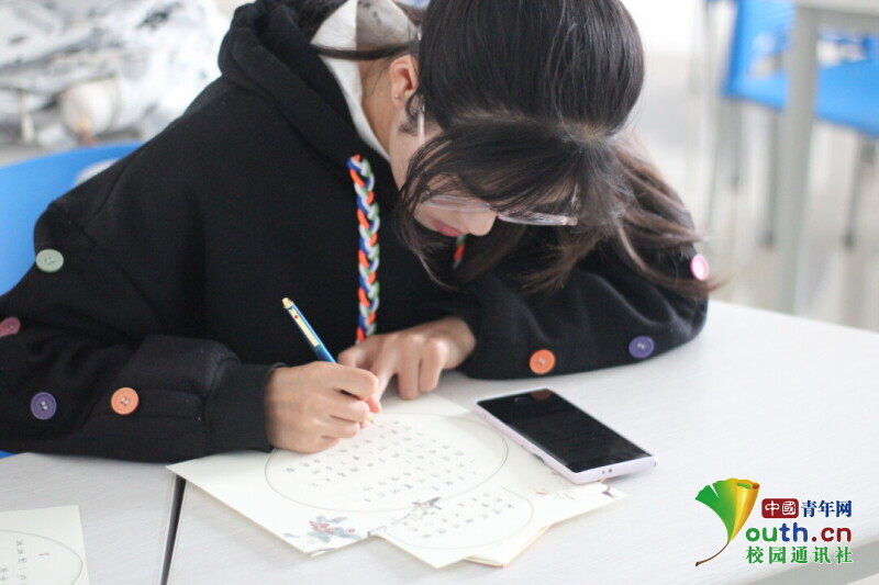 图为参与同学书写”平安喜乐“。中国青年网通讯员 韩熠桢 供图