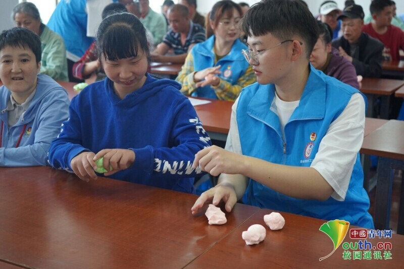 图为工作人员教同学如何用黏土搓圆。中国青年网通讯员 费苇琦 供图