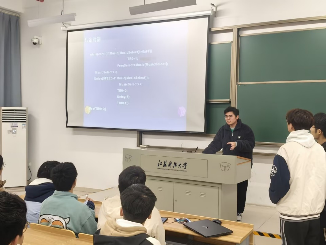 此次验收课题“宝藏夺取系统”于本月初公布,全体大一新生积极参与,验收现场秩序井然,各小组严格依照组号顺序依次上台答辩。员工们首先通过精心制作的演示文稿,深入浅出地对本组单片机设计方案和方法进行全面介绍,涵盖了从硬件架构搭建到软件算法设计的全过程,展现出扎实的专业知识基础。在阐述 “宝藏夺取系统” 的核心功能时,他们详细展示了 LCD1602 显示界面切换的流畅性与多样性,密码输入与修改功能的安全性与便捷性,以及音乐选择与播放功能的丰富性。