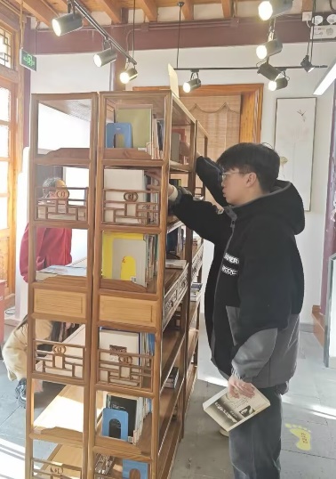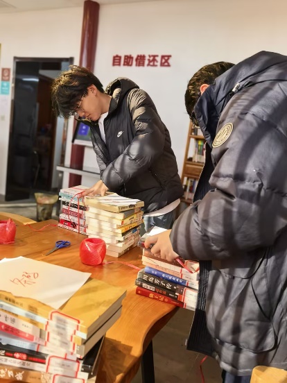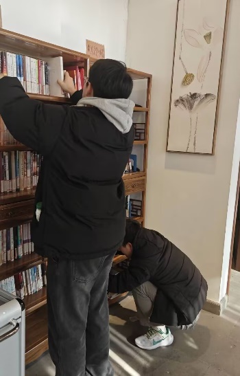 与此同时,在上河书房,“阳光志愿团”的同学们承担整理书架和打包书本的任务,他们耐心细致地将每一本书分类归位,确保书籍整齐摆放,方便读者查找。为了完成这一工作,他们不仅需要细致地核对书籍分类编号,还要时刻保持对书架整体布局的关注,力求每一个细节都做到完美。同学埋头在书架间忙碌,仔细核对书籍的标签和编号,将同一类别的书籍归拢放在一起。