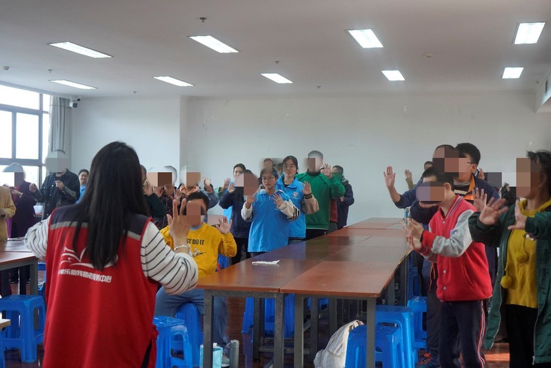 图为志愿者们与托养中心学员合唱歌曲《听我说谢谢你》。张京供图