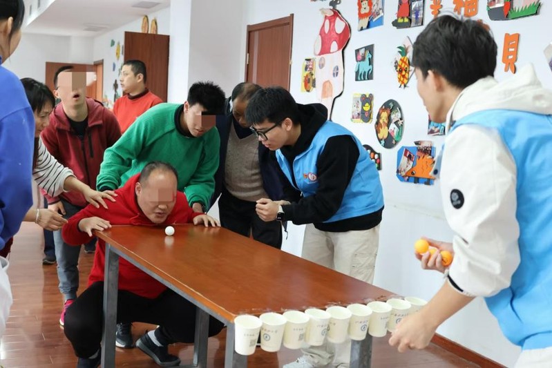图为志愿者成员鼓励托养中心学员完成吹球挑战。张京供图