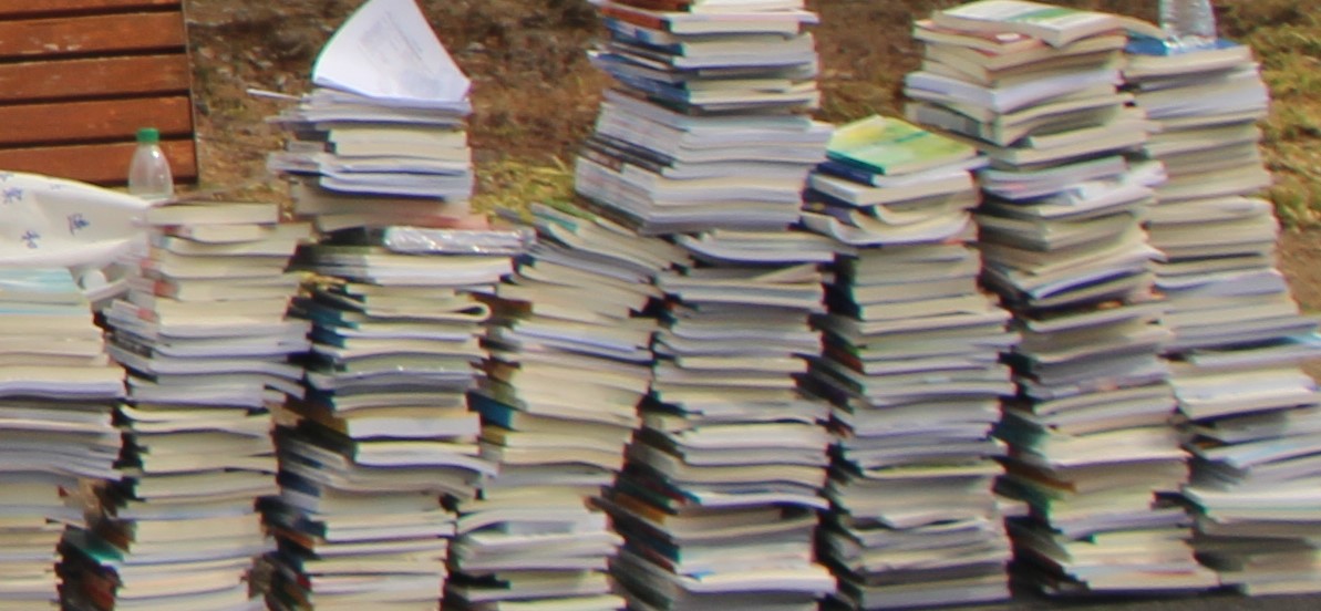 图为同学们捐的书籍已堆积成山(霍达 供图)
