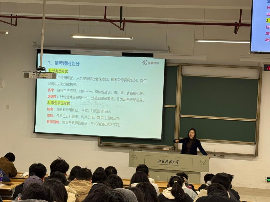 岱老师为同学们介绍了体制内的就业方向,包括政府部门、国企、军队文职等岗位,对公务员考试的政策和考情进行了详细解读,从国考、省考的区别讲起,深入剖析了江苏地区公务员考试的招录流程、岗位设置以及历年的报考数据和竞争情况。在考试内容讲解环节,围绕行测和申论两大科目,系统地介绍了各题型的命题规律和答题技巧。