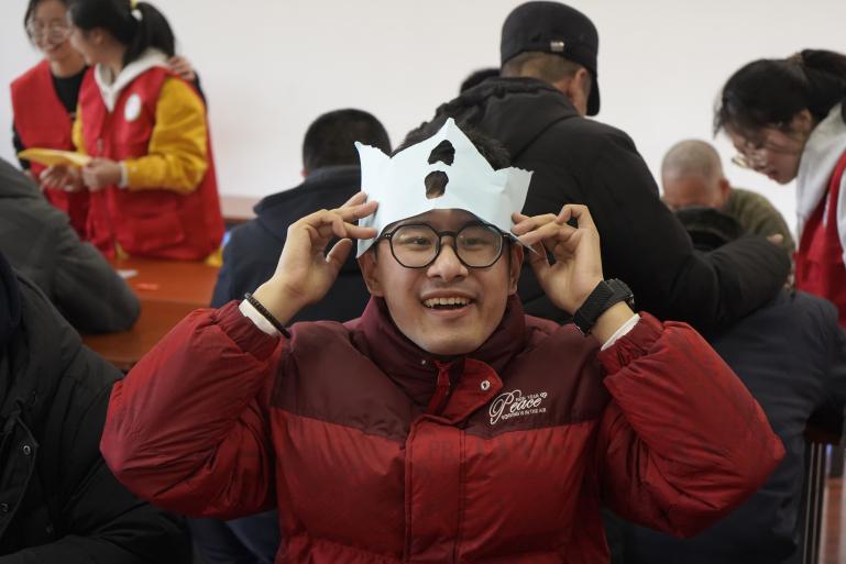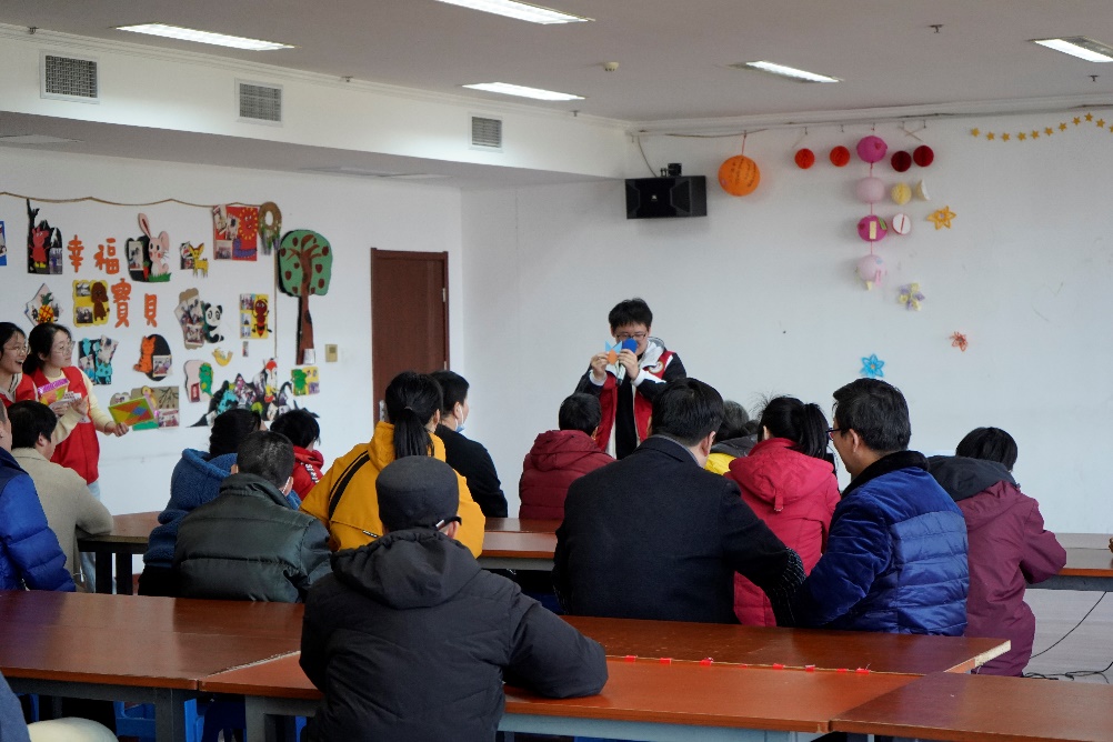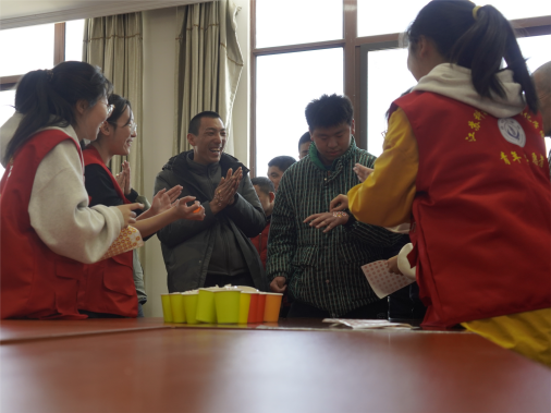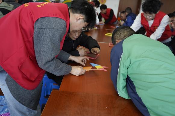 同时,志愿者们精心准备了众多互动游戏,例如“乒乓球进杯”、“创意撕纸”、“益智七巧板”等。在主持人的号召下,他们积极参与其中。在“创意撕纸”活动中,志愿者耐心地引导他们撕出各式各样的图案,激发他们的创造活力。他们撕出的“笑脸”,是他们对社会最美好的回应。