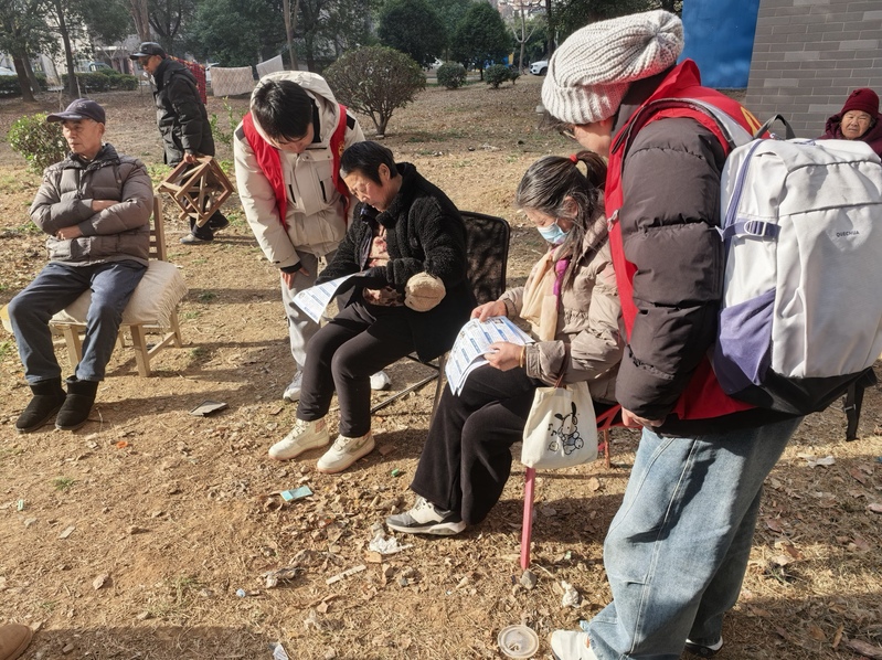 讲解过程中,互动交流的场景温暖而热烈。一位老人低头翻看手册时,指着“陌生链接风险”板块轻声询问,身旁的实践团成员立刻俯身凑近,放慢语速、提高音量,指着对应的警示图标耐心解释:“您手机里收到的陌生短信链接,哪怕看着像官方通知也别点,很多诈骗就是通过点击链接偷取个人信息,进而转走账户资金的。”柔和的讲解、细致的回应,让老人们不时点头赞许,或是用手指着手册上的内容同步对照,现场氛围专注而平和。不少老人一边听一边主动提问,队员们都逐一耐心解答,确保每一位老人都能听懂、记牢。