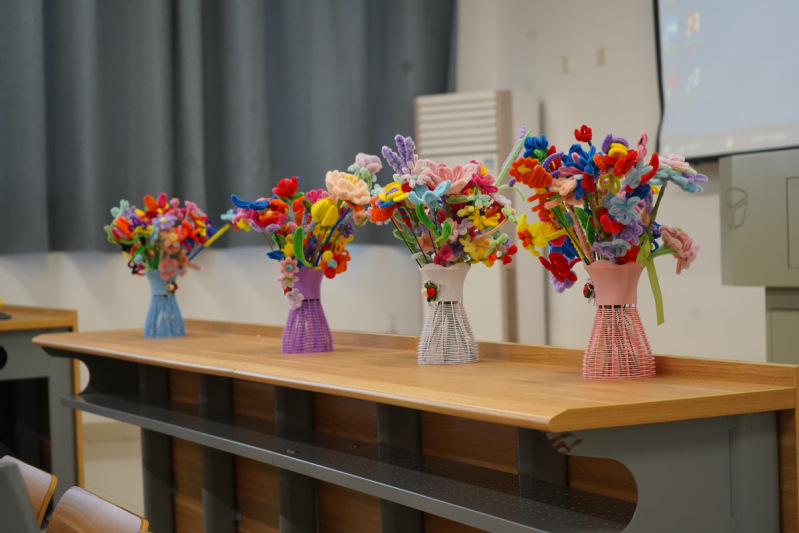 在“妙手生花”环节中,同学们用扭扭棒、花杆、花艺胶带、剪刀等材料制作手工花朵,将制作完成的扭扭棒花朵用花艺胶带固定在花杆上,将成品插入准备好的花瓶中。每个成品都美轮美奂,巧夺天工。该活动既锻炼了同学们的动手能力,又让同学们切身地体会到了春天百花齐放的美丽。