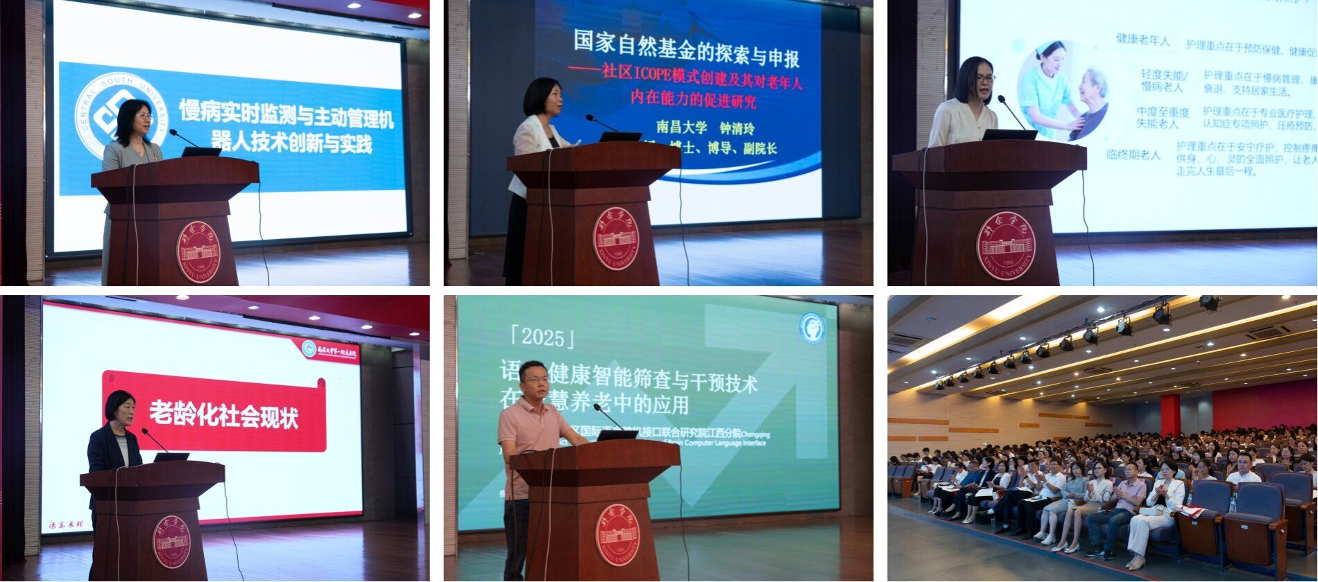 主论坛上,中南大学冯辉教授以《社区居家慢病实时监测与主动管理机器人技术创新与实践》为题,介绍了主动管理机器人技术在社区居家慢病管理中的应用进展及未来发展方向,提出了“防-治-康-护-管”技术创新思路。南昌大学钟清玲教授向大家介绍了护理学国家自然科学基金的申报方向,并从选题、立项依据、研究内容、可行性、创新性等多个方面剖析自然科学基金的撰写方法。赣南医科大学丁梅教授主讲老年护理的技术创新与人文关怀的融合报告,从背景、智慧护理技术的未来发展、智慧护理的服务模式转型、跨越数字鸿沟的思考、运行模式等五个方面展示了老年护理的智慧未来。江西省护理学会秘书长王建宁教授就老龄化社会现状、国家相关政策和带给我们的思考三个部分,科学分析了老龄化时代背景下的养老护理现状及未来趋势。重庆市沙坪坝区国际语言脑机接口联合研究院江西分院吴振华经理介绍了脑机接口技术及语言健康智能筛查与干预技术在智慧养老中的应用。报告内容涵盖智慧养老和老年护理的现状与展望、观点深刻、高屋建瓴,引发了与会者的深刻思考。