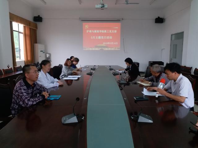 2019年5月14日护理与康复学院在会议室召开5月份主题党日活动,会议由党支部书记张小冬主持召开,全体教工支部党员参会。