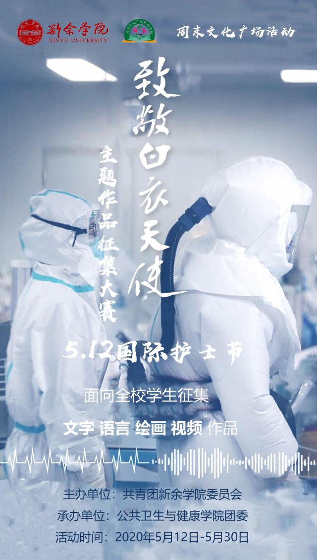新冠肺炎疫情爆发以来,广大医护工作者舍小家为大家,逆流而上无私无畏的事迹,感动着人民群众的心。为深入学习贯彻习近平总书记给北京大学援鄂医疗队90后党员重要回信和关于疫情防控工作的重要指示精神,纪念“5.12国际护士节”,弘扬南丁格尔救死扶伤的人道主义精神和为护理事业无私奉献的高尚品质,激发广大青年爱岗敬业、积极进取,勇于奉献的工作品质和全心全意为人民服务的工作热情,在5.12国际护士节到来之际,决定开展“致敬白衣天使”主题作品征集大赛暨周末文化广场活动。现将活动有关事项通知如下: