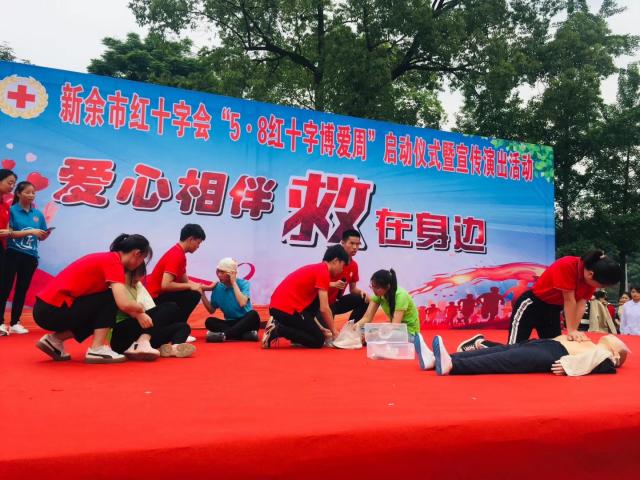 ​2019年5月8日下午2:00在市抱石公园广场,为纪念第72个“世界红十字日”,凝聚更多的社会力量参与和支持红十字事业,唤起全社会对红十字事业的关心与支持,由新余市文明办、新余市红十字会主办,江西省东华盛典文化传媒有限公司承办开展“5.8红十字博爱周”启动仪式暨宣传演出活动。本次活动以“爱心相伴‘救’在身边”为主题,参加人员为市县文明办、红十字会领导、护理与康复学院吴玉华经理、红十字会会员、各志愿服务队队员、社会群众和爱心企业代表等。