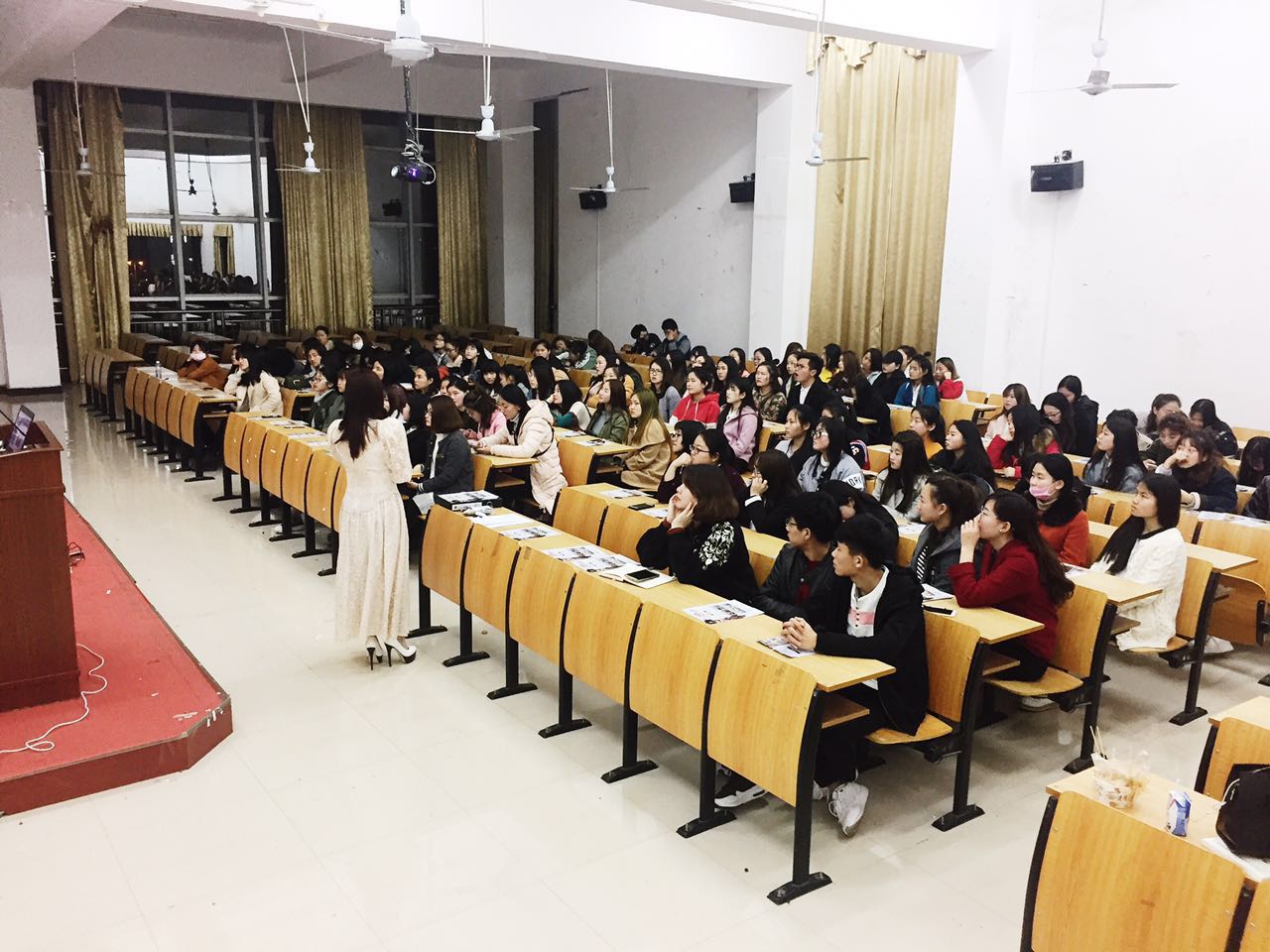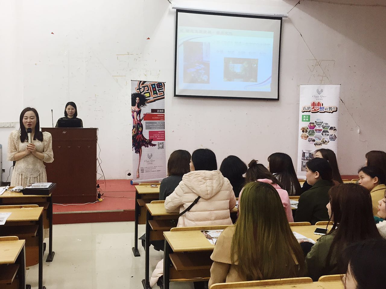 1月27日,在医学楼三楼多媒体教室,护理与康复学院便迎来了第一场招聘会。此次招聘方为上海荣恩整形美容公司,参加人员有来自上海荣恩的罗琳娜经理一行以及我们护理与康复学院医学美容专业所有同学。